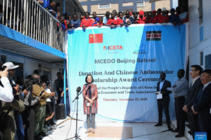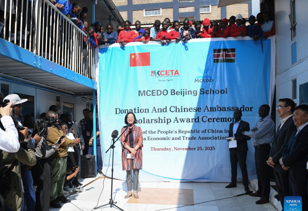 Chinese Ambassador to Kenya Guo Haiyan speaks during a donation ceremony held at MCEDO Beijing School in Nairobi, Kenya, on Nov. 25, 2025. (Xinhua/Li Yahui) The Chinese Embassy in Kenya and the Kenya-China Economic and Trade Association (KCETA) on Tuesday donated 11 million Kenyan shillings (about 84,800 U.S. dollars) to support renovations and infrastructure upgrades at MCEDO Beijing School…