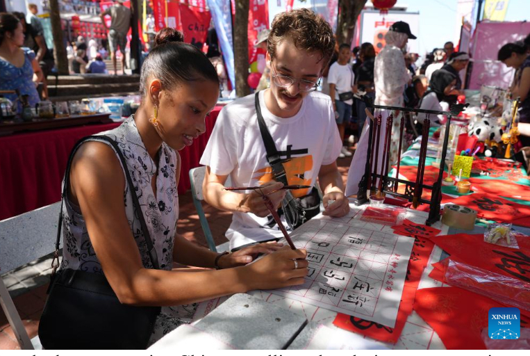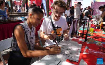 People learn to write Chinese calligraphy during an event in celebration of the Chinese New Year in Cape Town, South Africa, on Feb. 1, 2026. The bustling Victoria & Alfred Waterfront in Cape Town, South Africa’s legislative capital,came alive with vibrant colors and lively performances on Sunday as the upcoming Chinese New Year was celebrated. The…