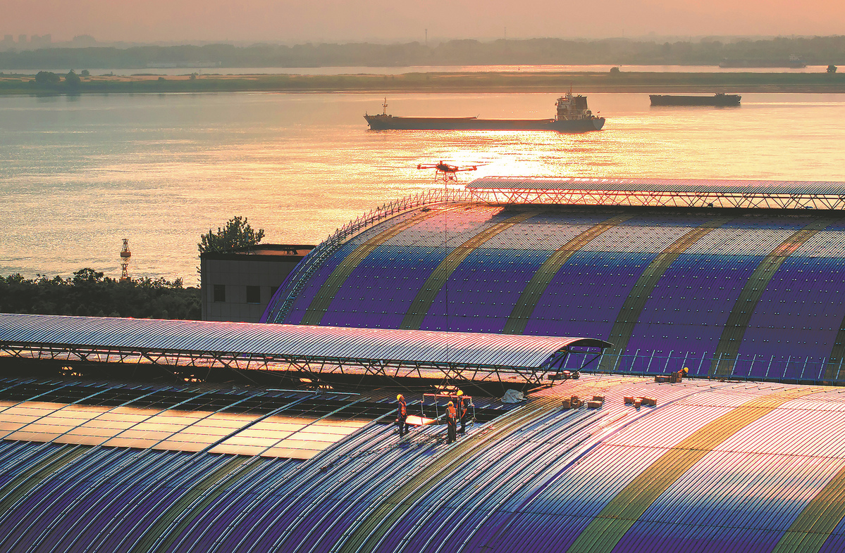 Employees use a drone to maneuver photovoltaic panels for installation on the roof of a coal shed in Ma’anshan, Anhui province, on May 5, 2025. ZHANG MINGWEI/FOR CHINA DAILY