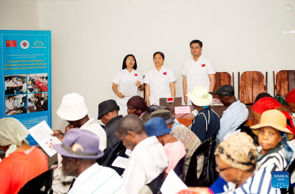 Members of the 17th batch of the Chinese medical team in Botswana (rear) are pictured during a joint medical outreach and specialist consultation program for elderly residents at MokolodiVillage, about 18 km southwest of Gaborone, Botswana, Nov. 1, 2025. (Photo by Tshekiso Tebalo/Xinhua)
