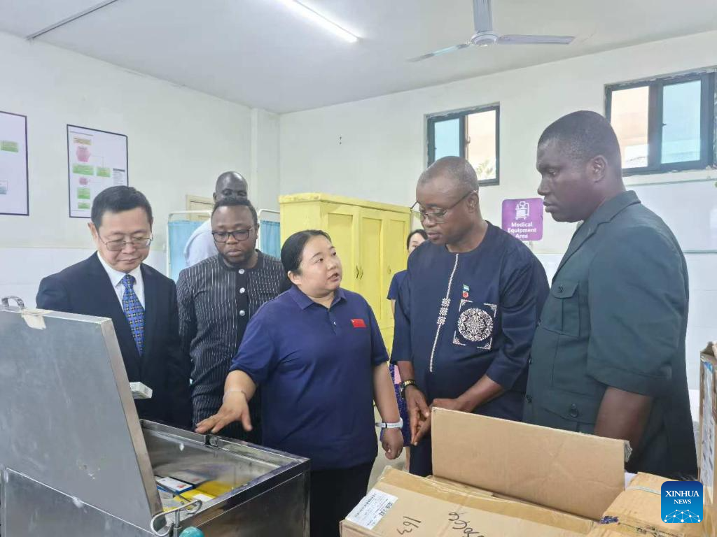 A member of the 26th batch of the Chinese medical team to Sierra Leone introduces medical devices to Sierra Leonean representatives at the Sierra Leone-China Friendship Hospital in Freetown, Sierra Leone, Nov. 12, 2025. The China-aided Cardiac Intensive Care Unit, the first of its kind in Sierra Leone, has officially launched at the Sierra Leone-China Friendship Hospital in Freetown, the capital.(The 26th batch of the Chinese medical team to Sierra Leone/Handout via Xinhua)